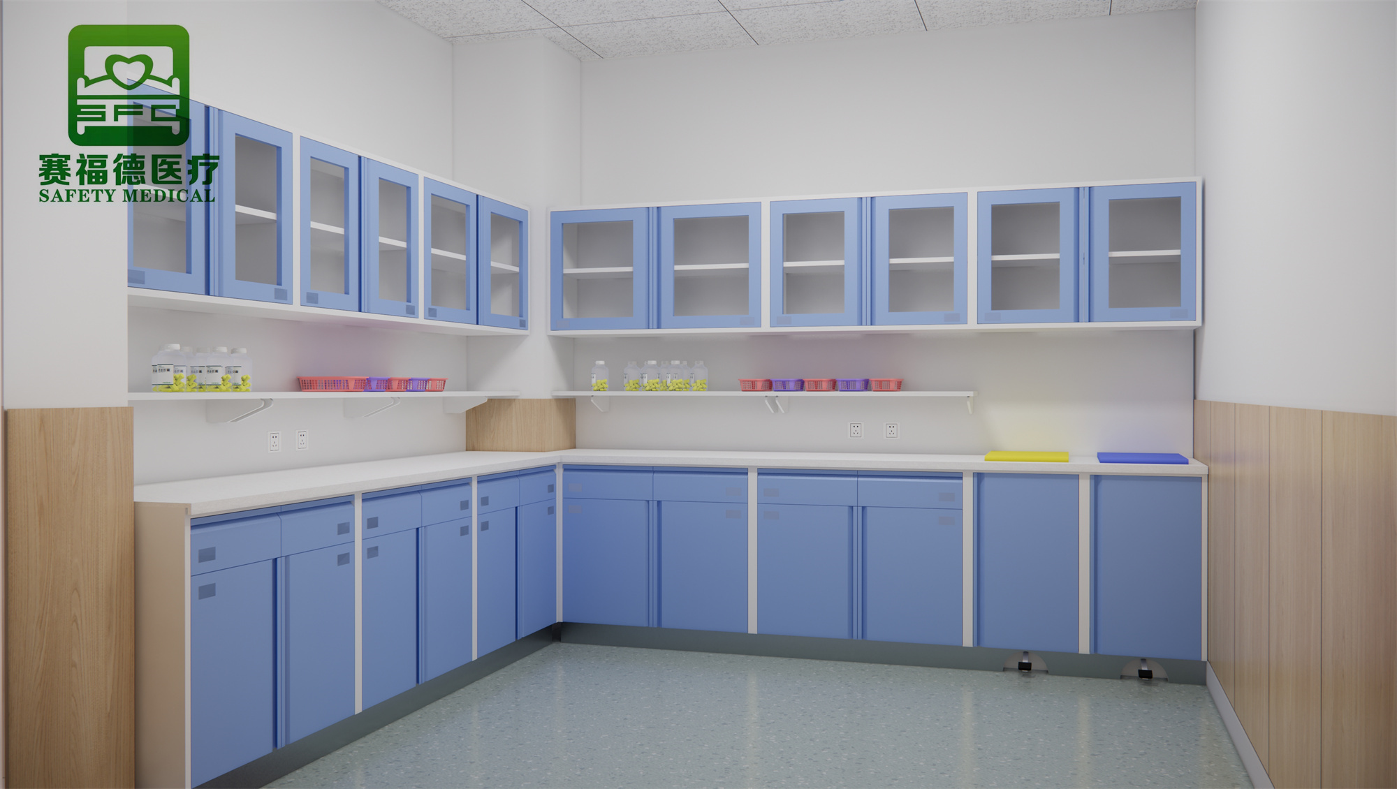 在设计方面,赛福德治疗柜充分考虑了洁、污物品的层次分类,强调防止交叉感染,从根本上为使用者提供安全清洁的使用环境。例如,在处置室和治疗室制作互通式垃圾柜,从治疗室投入医疗垃圾,再从处置室取走,防止治疗室洁净区造成污染。对治疗柜进行圆角处理可以减少不必要的意外伤害,扶手端头的曲面处理符合人轻扶时的手心曲线,功能上也是为了缓冲人体接触,大大提升安全性。
